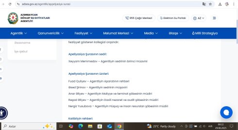 Xatırladaq ki, Azərbaycan Dövlət Su Ehtiyatları Agentliyinin Apellyasiya Şurası sahibkarlıq fəaliyyəti göstərən fiziki və hüquqi şəxslərin öz sahibkarlıq fəaliyyəti ilə bağlı Agentliyin və ya onun struktur (yerli) qurumlarının qərarlarından, hərəkət və ya hərəkətsizliyindən (korrupsiya ilə əlaqədar hüquqpozmalarla bağlı müraciətlər istisna olmaqla) verilmiş təkrar şikayətlərinə, habelə dövlət qulluğuna qəbulla bağlı keçirilən müsahibənin nəticələrindən namizədlərin verdikləri şikayətlərə baxan, ictimai (ödənişsiz) əsaslarla fəaliyyət göstərən kollegial orqandır.