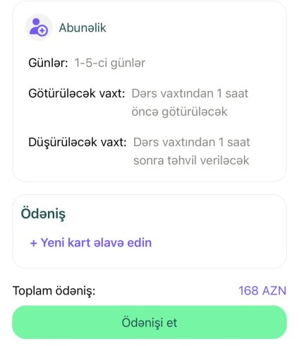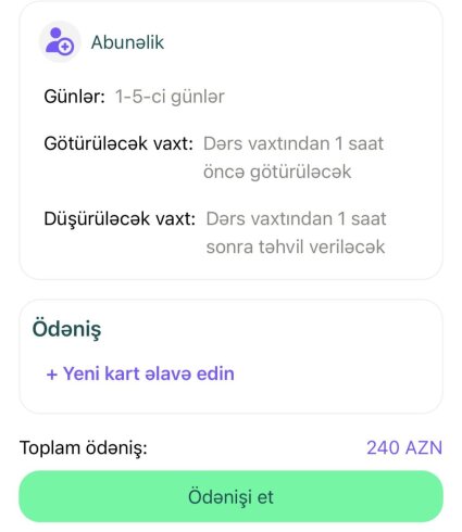 Xırdalan şəhərindən - 132-134 nömrəli məktəbə gediş-gəliş olmaqla aylıq qiymət 240 manat təşkil edir.