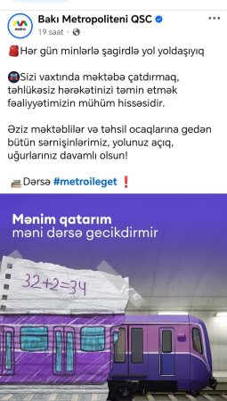 Metropoliten “Məktəbli avtobusları”na qarşı: “Dərsə metro ilə get” - FOTO Bu gün, 00:07 “Bakı Metropoliteni” QSC “Məktəbli avtobusları”na qarşı “dərsə metro ilə get” çağırışı edib.Tribunainfo.az xəbər verir ki, bu barədə “Bakı Metropoliteni” Feysbuk səhifəsində foto və məlumat paylaşıb.“Hər gün minlərlə şagirdlə yol yoldaşıyıqSizi vaxtında məktəbə çatdırmaq, təhlükəsiz hərəkətinizi təmin etmək fəaliyyətimizin mühüm hissəsidir.Əziz məktəblilər və təhsil ocaqlarına gedən bütün sərnişinlərimiz, yolunuz açıq, uğurlarınız davamlı olsun!”, – deyə məlumatda bildirilib. Facebook-da paylaş